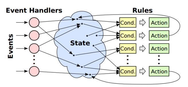 An event-driven state machine is a system with one or more state variables, whose behavior is determined by events. When an event occurs, the state machine takes actions based on the current state and the event. The actions can alter the state, which affects the way that future events are handled. The state machine definition is broad enough that it includes the rules-based approach as a special case. However, in most state machines the actions are determined directly from the events. Rules use a two-step approach where event handlers only modify state and never take actions. Rules then trigger based on the resulting state, which reflects the sum of the outside events.