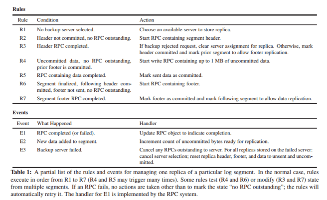 The following example shows a partial list of rules and events for replication a log segment in RAMCloud:
