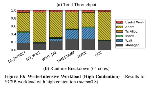 For a read-only workload, the 2PL schemes perform and scale much better than the timestamp-ordering based schemes. But even the best 2PL schemes are only spending ~30% of their cycles doing useful work – the rest are expended on coordination overheads of various kinds. For a write-intensive workload, the 2PL no-wait and wait-die variants give the highest throughput and best scalability.