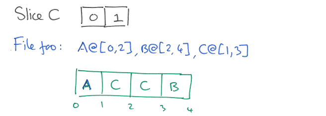 The basic idea is very easy to understand: file data is kept in immutable, arbitrarily-sized, byte-addressable, sequences of bytes called slices. Think of this like an old fashioned film reel containing a sequence of video frames. If a portion of the file is to be overwritten, the new bytes are written to a new slice (like recording a new take of a scene). We then go the the cutting room floor to splice the new slice into the original at the desired point. This is where the analogy breaks down a little, because Wave FS never changes the original bytes on disk. Instead information about the slices and splice-points is kept in metadata separate to the slices themselves. By reading the metadata and following the instructions there it is possible to reconstitute the current state of the file. A file in Wave FS is a sequence of slices and their associated offsets.