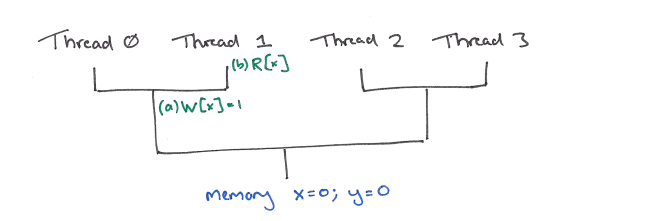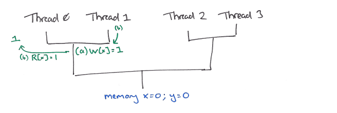 Finally (a) may then reach memory where x will be updated to the value 1.