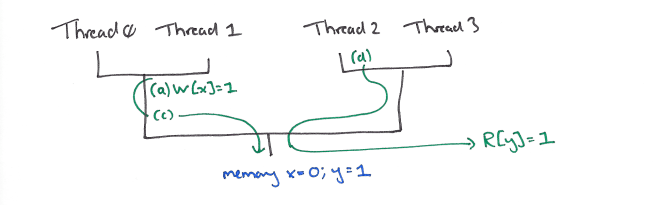 (c) and (a) can now be reordered, and (c) may flow down to satisfy the read (d) in thread 2.