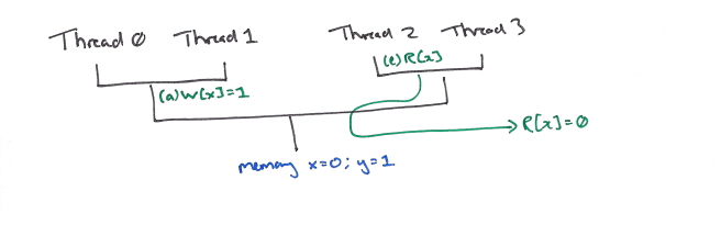 Let’s look at an example of the flowing model in action. Many different processor topologies are possible. Consider one in which the pair of threads 0,1 both share a queue, and the pair of threads 2,3 share another queue. We join the action when the memory contains (x=0;y=0), and threads 0, 1, and 2 are executing instructions as follows: