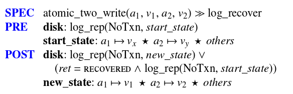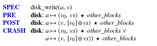 Note that in addition to the normal PRE and POST conditions, we also have a CRASH condition. The crash condition specifies the possible states the system could be in at the time of a crash. (The ∗ operator in the above example is using separation logic to enable us to say that the rest of the disk blocks remain unchanged).