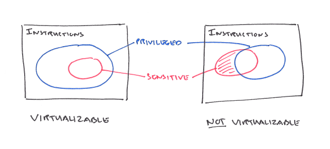 The theorem provides a fairly simple condition sufficient to guarantee virtualizability, assuming, of course, that the requisite features of “conventional third generation machines” are present. However, those features which have been assumed are fairly standard ones, so the relationship between the sets of sensitive and privileged instructions is the only constraint. It is a very modest one, easy to check. Further, it is also a simple matter for hardware designers to use as a design requirement.
