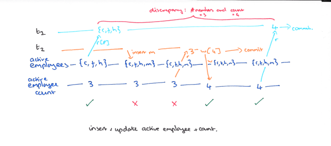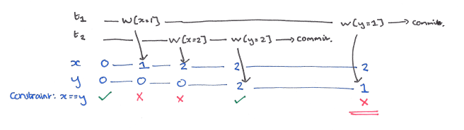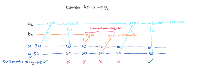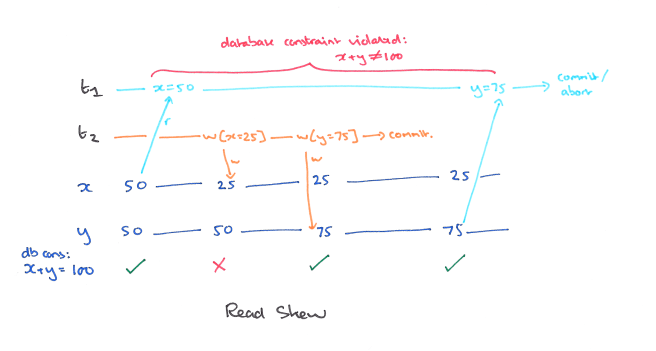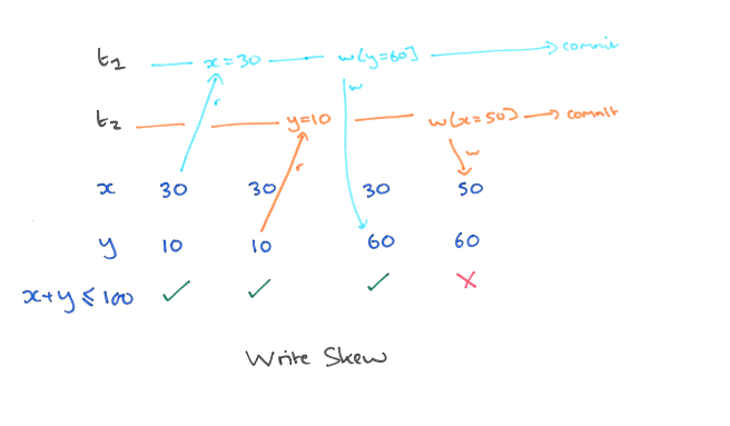 Write skew is very similar. Suppose our constraint is x+y ≤ 100. And this time we interpose a transaction before T1 issues a write: