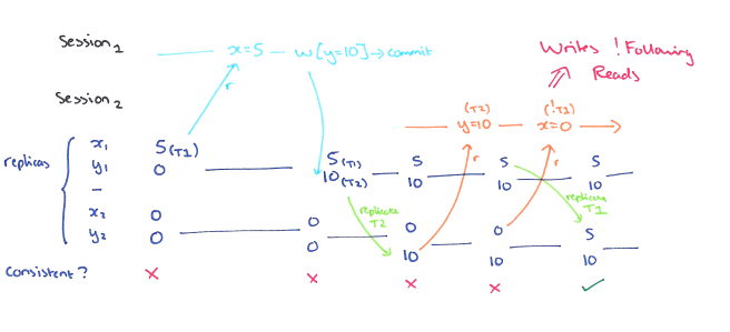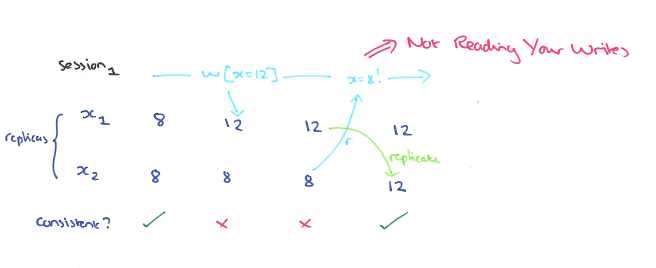Very nice post, thank you. Interestingly, it looks like a PRAM shared memory system as described in the TR of Lipton and Sandberg [1] does guarantee read your own writes. A read reads from the local memory, a write writes locally before starting a global write, and a write does not wait for the global write to finish. The Tanenbaum book and other references do refer to them interchangeably, though. But, even the Tanenbaum definition leaves the behavior of the writer open: Writes done by a single process are seen by all other processes in the order they were issued. It does not say anything about the behavior of the writer.