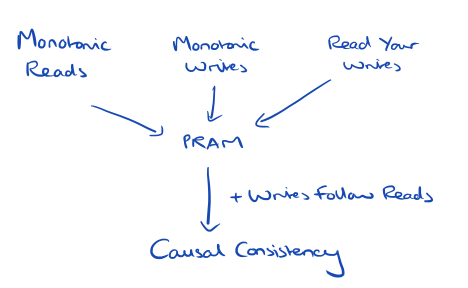 If we combine the Monotonic Reads, Monotonic Writes, and Read Your Writes guarantees we get PRAM (Pipelined Random Access Memory) consistency. If we add Writes Follow Reads to PRAM, we get Causal Consistency.
