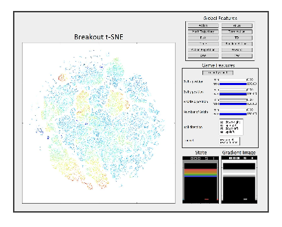 Here’s a picture of the tool in action. On the left-hand side you see the t-SNE visualisation, and on the right-hand side you have tool for visualising global features (top), game specific features (middle), and the chosen state and its corresponding gradient image (bottom). (Here we’re playing Breakout).