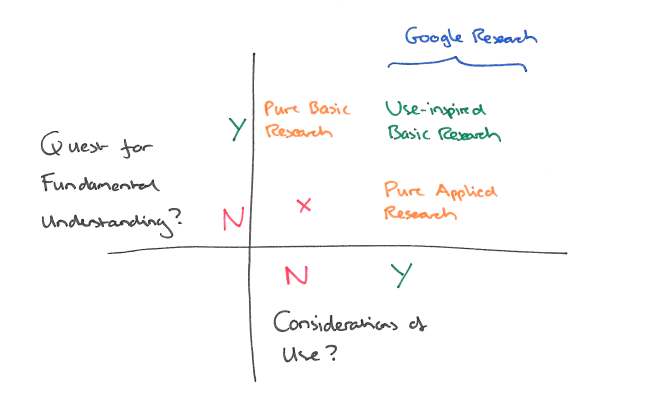 The overall aim of research at Google is to bring significant practical benefits to Google’s users, and to do so within a few years at most. Within Pasteur’s Quadrant model, Google does ‘use-inspired basic’ and ‘pure applied’ CS research.