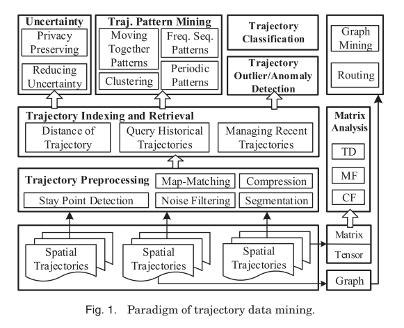 In ‘Trajectory Data Mining,’ Zheng conducts a high-level tour of the techniques involved in working with trajectory data. This is the data created by a moving object, as a sequence of locations, often with uncertainty around the exact location at each point. This could be GPS trajectories created by people or vehicles, spatial trajectories obtained via cell phone tower IDs and corresponding transmission times, the moving trajectories of animals (e.g. birds) fitted with trackers, or even data concerning natural phenomena such as hurricanes and ocean currents. It turns out there’s a lot to learn about working with such data! Here’s a map of the territory covered in the paper: