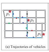 Different from the aforementioned models aiming at the retrieval of existing trajectories by different queries, a new series of techniques infers (or say “constructs”) the most likely k route(s) that a moving object could travel (i.e., the missing subtrajectory) between a few sample points based on a bunch of uncertain trajectories. The major insight is that trajectories sharing (or partially sharing) the same/similar routes can often supplement each other to make themselves more complete. In other words, it is possible to interpolate an uncertain trajectory by cross-referring other trajectories on (or partially on) the same/similar route. That is “uncertain + uncertain → certain.” For example, given the uncertain trajectories of many taxicabs (marked by different colored points in Figure 13(a)), we could infer that the blue path is the most likely route traversing (p1,p2,p3).