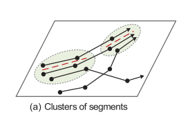 Trajectories are partitioned into line segments, and groups of close trajectory segments can be found using the Trajectory-Hausdorff Distance. A representative path is then found for each cluster of segments.