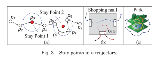 Li et al. [2008] first proposed the stay point detection algorithm. This algorithm first checks if the distance between an anchor point (e.g., p5) and its successors is in a trajectory larger than a given threshold (e.g., 100 m). It then measures the time span between the anchor point and the last successor (i.e., p8) that is within the distance threshold. If the time span is larger than a given threshold, a stay point (characterized by p5, p6, p7, and p8) is detected; the algorithm starts detection of the next stay point from p9. Yuan et al. [2011b, 2013b] improved this stay point detection algorithm based on the idea of density clustering. After finding p5 to p8 is a candidate stay point (using p5 as an anchor point), their algorithm further checks the successor points from p6. For instance, if the distance from p9 to p6 is smaller than the threshold, p9 will be added into the stay point.
