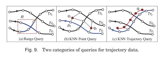 There are two major types of queries we want to support over trajectory data: range queries and K-Nearest-Neighbour (KNN) queries: