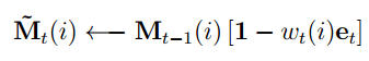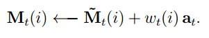 Writes are decomposed into two parts: an erase followed by an add. Given a weighting vector wi emitted by a write head at time t, along with an erase vector ei whose M elements all lie in the range (0,1), the memory vectors Mt-1(I) from the previous time-step are modified as follows: