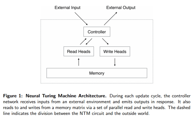 A Neural Turing Machine (NTM) architecture contains two basic components: a neural network controller and a memory bank. Like most neural networks, the controller interacts with the external world via input and output vectors. Unlike a standard network, it also interacts with a memory matrix using selective read and write operations. By analogy to the Turing machine we refer to then etwork outputs that parametrise these operations as “heads.”
