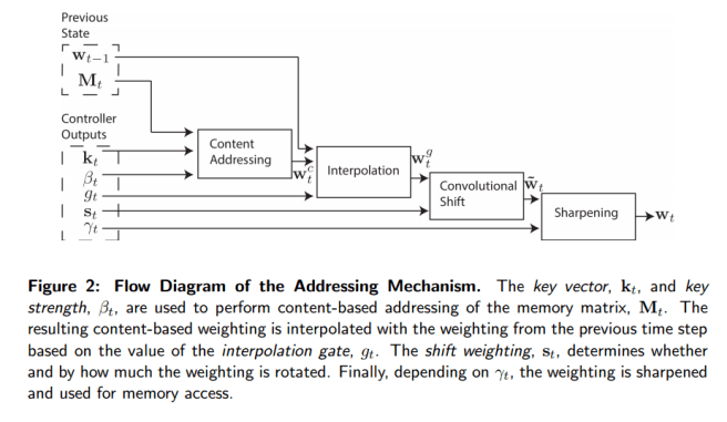 The combined addressing solution works as follows. Firstly the content-addressing weightings are calculated. Then these weightings are blended with those from the previous time-step according to an interpolation gate scalar g ∈ (0,1) emitted by each head to produce the gated weighting.