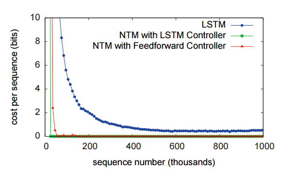 You can see in the following figure that the LSTM based NTM significantly outperforms a standard LSTM on the copy task discussed earlier.