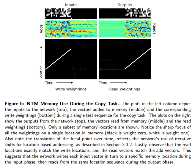 What’s also very interesting is this breakdown of how the NTM actually uses its memory during the copy task (you can see the weightings in the address vector moving along the memory over time).