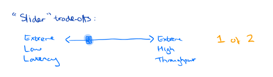 Understanding fundamental trade-offs in a design space is always very useful. There are ‘opposing pair’ trade-offs which explore a 2-dimensional space – I mentally picture these as sliders you can set between two extremes. For example, the trade-off between extreme low-latency on the one hand, and extremely high-throughput on the other. Or between security and ease-of-use.