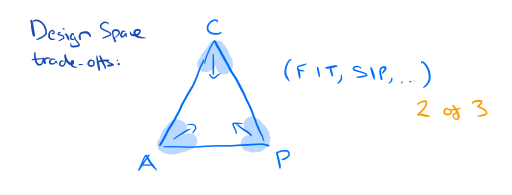 This paper follows the popular X,Y,Z – pick 2 meme. Essentially we’re exploring a three-dimensional space, or you can think of it as a triangle. Take any 2 of the 3, and you don’t have to trade-off between them, but put all three together and you do (interestingly, you can often get very close to the points of the triangle, you just can’t get all the way – this is the difference between the impressive sounding theory and pragmatic system designs). SIP (this paper), FIT, CAP, CAC, and the classic Quality-Function-Schedule all come to mind.