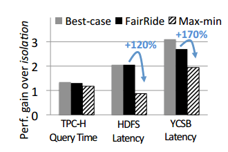One of the most popular solutions to achieve efficient resource utilization while still providing isolation is max-min fairness. As we’ll see, max-min fairness can be gamed. The authors introduce a new derivative they call FairRide, which by compromising ever so slightly on Pareto-efficiency, is able to provide both isolation and strategy-proofness. Compared to independent (fully isolated caches), FairRide gives a 2.6x cache efficiency improvement, is much more robust in the face of gaming / noisy neighbours in a shared cache environment, and is able to get within 3-13% of the absolute best-case performance while providing these guarantees.