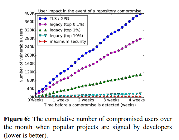 Figure 6. shows the benefits of the legacy and maximum security models over the current TLS and GPG mechanism. Increasing the number of popular packages that are signed by developers dramatically increases security. “If the most popular 1% of projects are signed by developers (406 projects), then 73% of users are protected. If the top 10% of projects sign their project, then 96% of users are protected.”
