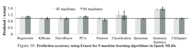 - Ernest predicts run times with less than 20% error on most workloads, with less than 5% overhead for long running jobs (training time is below 5% of the actual running time of the job).
