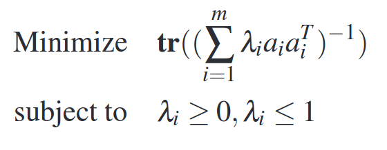 In optimal experiment design we choose feature vectors (i.e. _ai) that minimize the estimation error. Thus we can frame this as an optimization problem where we minimize the estimation error subject to constraints on the number of experiments. More formally, we can set λi as the fraction of times an experiment is chosen and minimize the trace of the inverse of the covariance matrix: