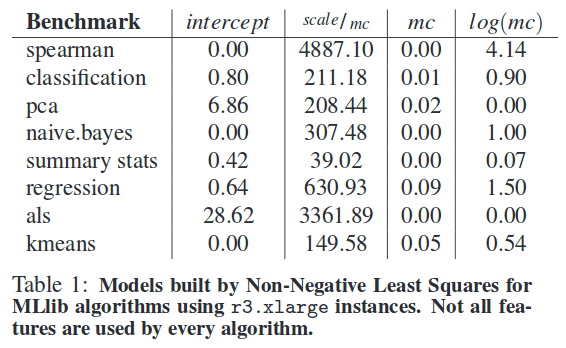 The authors trained an NNLS model using just 7 data points on all of the machine learning algorithms from MLlib in Apache Spark 1.2. The final model parameters are show below – notice that not all features are used by every algorithm, and the contribution of each term differs with every algorithm.