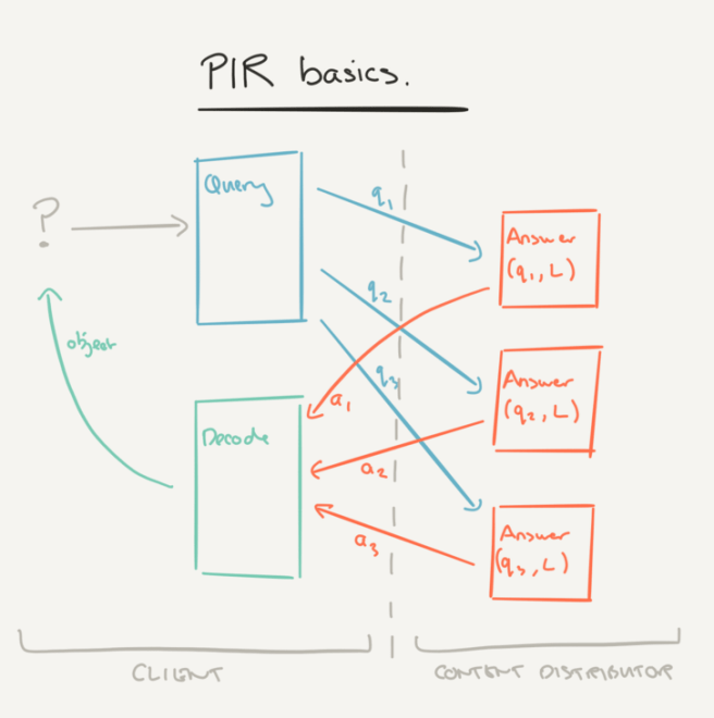 PIR protocols are broken down into Query, Answer, and Decode procedures. A that client wants to retrieve object b, invokes Query(b) which returns a set of k query vectors, one for each of the k servers. Each query vector q is sent to the corresponding server, which replies with Answer(q, L). The client aggregates all of the answers and computes Decode(a1,…,ak) to recover the desired object.