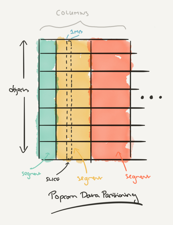 Media objects are divided into segments containing for example a few seconds or minutes of video. Segments lengths vary (segment 2 may be longer than segment 1 for example), but they are the same across all objects. The library is divided into columns which are stacks of corresponding segments across all objects. Columns are further subdivided into 1MB wide slices, which are the work units assigned to physical machines.