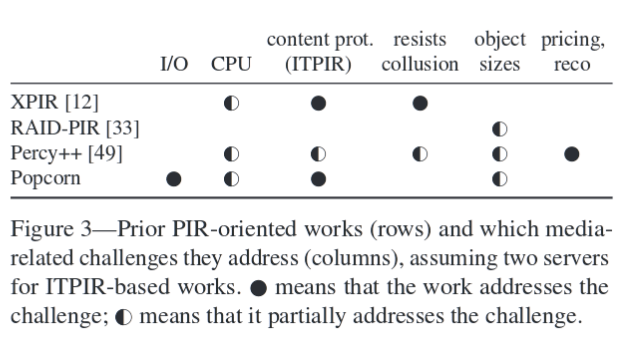 If, like me, you don’t know very much about the world of Private Information Retrieval (PIR), your first question may well be “how can it be that even the service provider doesn’t know what media you are consuming?”. This paper provides a very good background to PIR and plenty of references as a jumping off point for exploring that question. If you do know something about PIR (which you will in a moment if you keep reading :) ), your next question might be, “how on earth does Popcorn manage to make this practical?” Popcorn uses a blend of PIR techniques, and relies on sufficient client request volume to support efficient batching of requests to pull this off.