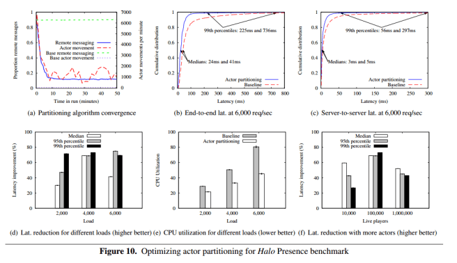 Within 10 minutes of the start of a 100K concurrent player test on a cluster of 10 servers, the proportion of remote actor communications falls to about 12% (vs the 90% baseline with the random placement policy). Locality aware actor partitioning reduces the 99th percentile latency by more than 3x, with gains more significant as loads increase. CPU utilization per server is reduced by 25% at lower system load, and 45% at higher load due to the reduction in serialization overheads.