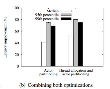 The optimized actor partitioning is the primary factor contributing to the latency improvement. Yet, combining both optimizations yields additional latency savings as shown in Figure 11(b): Optimizing the thread allocation provides additional reduction of 21% in the median latency, and 9% in the 99th percentile latency. In total, ActOp reduces the median latency by 55% and the 99th percentile by 75% over the baseline configuration.