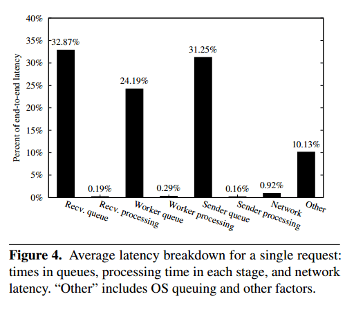 We use the default thread allocation policy in Orleans: a thread per stage per CPU core. We profile a request from the moment it arrives until it leaves the server. Queueing delay dominates the end-to-end latency, and by far exceeds the network latency, as well as the processing time in each stage. This is a symptom of an incorrect allocation of threads across the stages… Thread allocation policy drastically affects the end-to-end latency: the worst performing allocation results in 4x higher latency than the best-performing allocation. Notably, the default configuration used in Orleans is among the worst-performing configurations.