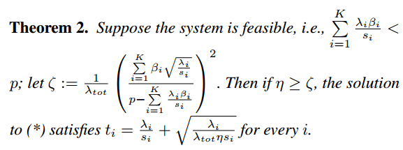 For each queue/stage the M/M/1 latency function 1/(μi – λi) is used where μi is the service rate of the queue i, and λi is the arrival rate. The weighted average of this per-queue latency across all queues is used as a proxy for the end-to-end latency. Multi-threading overheads (context switching) are addressed by adding a regularization parameter that promotes solutions that favor fewer threads. Under the constraints that each stage must service events at least as fast as they arrive, and that the available resources at the server are not exceeded, the minimization problem yields a closed form solution:
