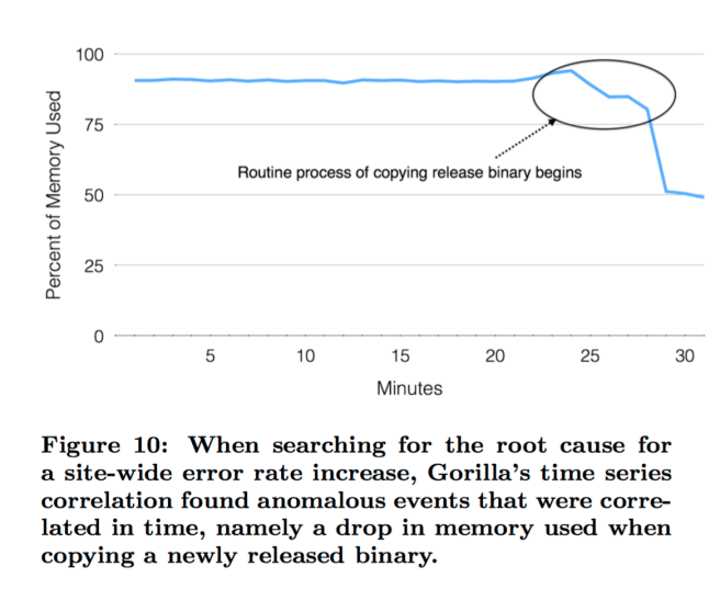 Error rates across one of Facebook’s sites were spiking. The problem had first shown up through an automated alert triggered by an in-memory time-series database called Gorilla a few minutes after the problem started. One set of engineers mitigated the immediate issue. A second group set out to find the root cause. They fired up Facebook’s time series correlation engine built on top of Gorilla, and searched for metrics showing a correlation with the errors. This showed that copying a release binary to Facebook’s web servers (a routine event) caused an anomalous drop in memory used across the site…