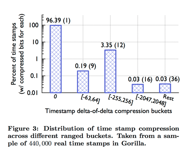 Figure 3 shows the results of time stamp compression in Gorilla. We have found that about 96% of all time stamps can be compressed to a single bit.