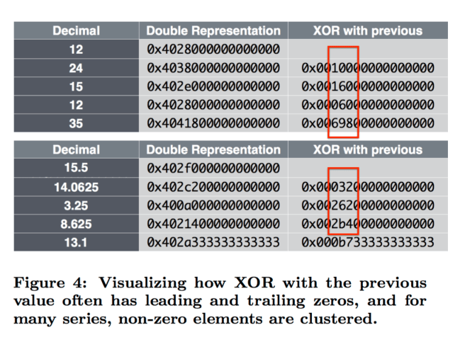The in-memory data structure is anchored in a C++ standard library unordered map. This proved to have sufficient performance and no issues with lock contention. For persistence Gorilla stores data in GlusterFS, a POSIX-compliant distributed file system with 3x replication. “HDFS, or other distributed file systems would have sufficed just as easily.” For more details on the data structures and how Gorilla handles failures, see sections 4.3 and 4.4 in the paper. I want to focus here on the techniques Gorilla uses for time series compression to fit all of that data into memory!