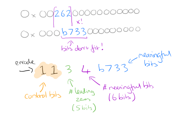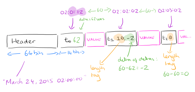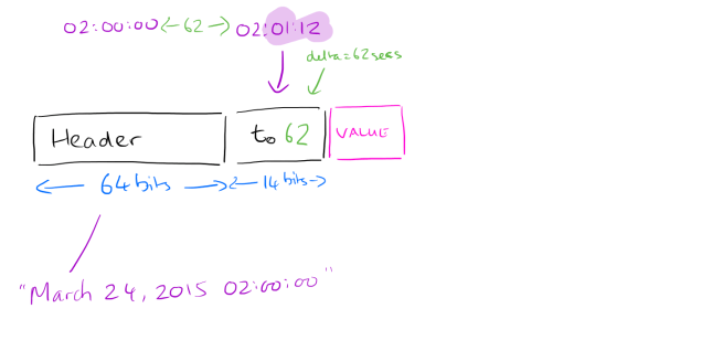 When it comes to time stamps, a key observation is that most sources log points at fixed intervals (e.g. one point every 60 seconds). Every now and then the data point may be logged a little bit early or late (e.g., a second or two), but this window is normally constrained. We’re now entering a world where every bit counts, so if we can represent successive time stamps with very small numbers, we’re winning… Each data block is used to store two hours of data. The block header stores the starting time stamp, aligned to this two hour window. The first time stamp in the block (first entry after the start of the two hour window) is then stored as a delta from the block start time, using 14 bits. 14 bits is enough to span a bit more than 4 hours at second resolution so we know we won’t need more than that.