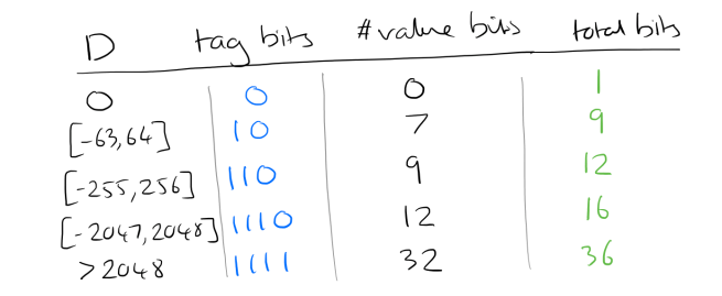 For all subsequent time stamps, we compare deltas. Suppose we have a block start time of 02:00:00, and the first time stamp is 62 seconds later at 02:01:02. The next data point is at 02:02:02, another 60 seconds later. Comparing these two deltas, the second delta (60 seconds), is 2 seconds shorter than the first one (62). So we record -2. How many bits should we use to record the -2? As few as possible ideally! We can use tag bits to tell us how many bits the actual value is encoded with. The scheme works as follows:
