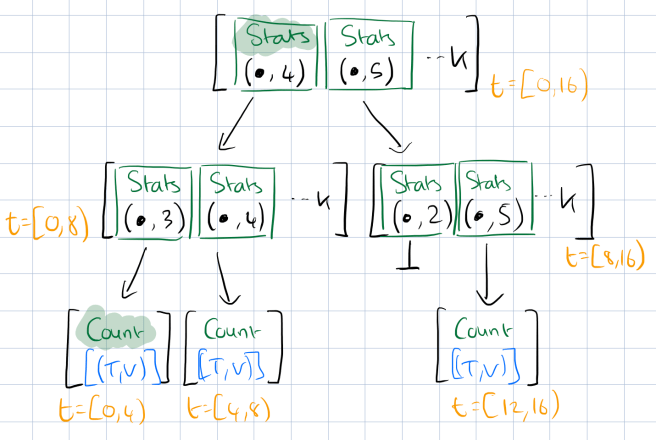 Let’s build up a tree for 16 ns of data. Here’s the starting tree that holds a list of time,value pairs for 4 ns of raw data at each leaf node.