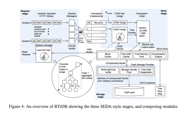 Using Ceph as the underlying store, BTrDB achieves a third-quartile write latency at maximum load (53 million points per second for a four-node cluster) of 35ms, which is less than one standard deviation from the raw pool’s latency. See the full paper for a detailed analysis of BTrDBs performance.