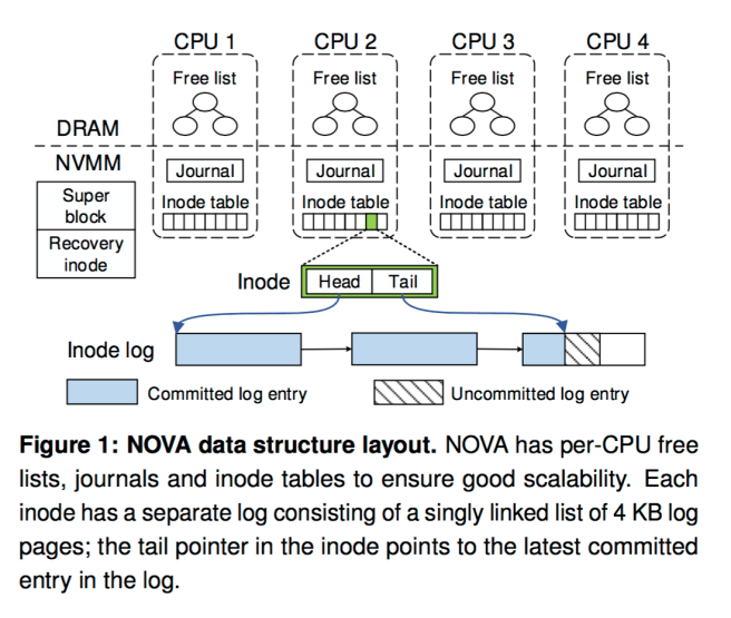 - Uses logging and lightweight journaling for complex atomic updates. NOVA’s log-structure provides cheaper atomic updates than journaling or shadow paging. “To atomically write to a log, NOVA first appends data to the log, and then atomically updates the log tail to commit the updates, thus avoiding both the duplicate writes overhead of journaling file systems and the cascading update costs of shadow paging systems.”