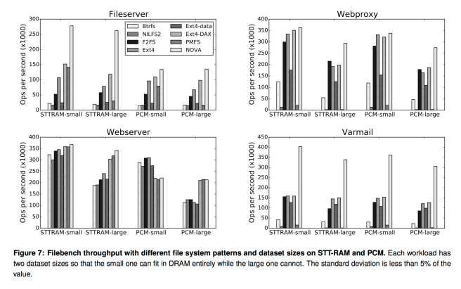 Figure 7 shows how NOVA compares to other file systems across four Filebench workloads: a file server, web proxy, web server, and varmail (emulates an email server).