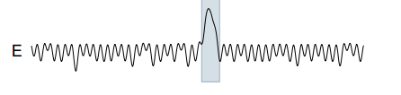 As an example of Tarzan at work, consider a noisy sine wave as the reference time series (A in the illustration below), and a synthetic anomaly introduced as a test (B in the illustration below – in which the period of the time series is temporarily halved). Tarzan shows a strong ‘suprise’ peak for the duration of the anamoly (E).