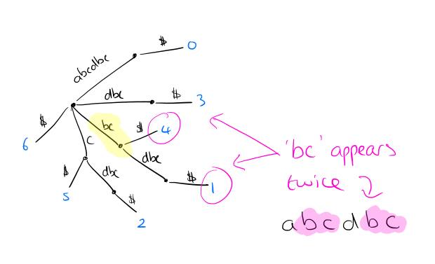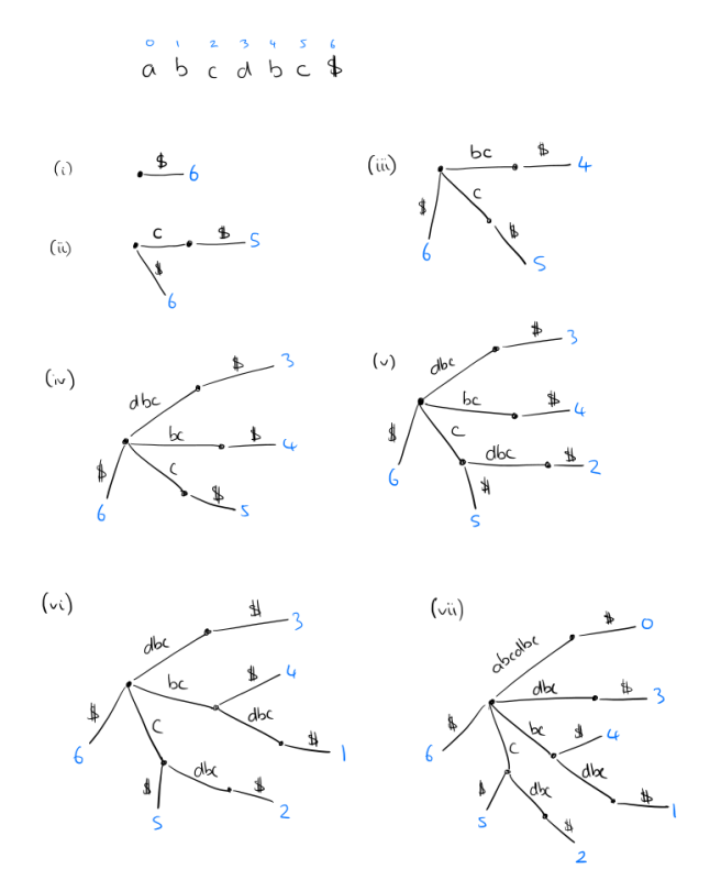 For a string of length n, a suffix tree has n leaves, numbered 1 to n, following a path through the tree from the root to leaf number i gives the suffix that begins at index i in the string. It’s easiest to understand the constructing by reversing the string and building the tree up from there as in the sketch below. But several clever constructions are available with O(n log|Σ|), as well as linear time on-line algorithms (i.e., proceeding character by character through the string from first to last).