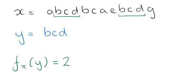 What we want to end up with is a string (ordered sequence) of symbols from the alphabet Σ. If a string x can be decomposed into the sequence uvw where u, v and w are substrings (or words) of x, then u is called a prefix of x, and w is called a suffix. A string y has an occurrence at position i of some text x if the substring of x starting at position i, of length |y|, is equal to y. The authors use fx(y) to denote the number of occurrences of y in x.